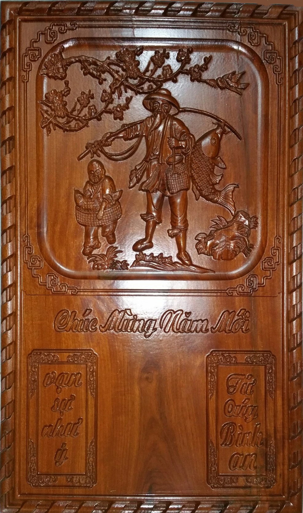 Cá chép: "Cá chép" tiếng hán đọc là "Lý ngư", phiên âm là "Yu yi", đọc gần giống với từ “Dư dả”. Do đó, hình ảnh cá chép có ý nghĩa là “Dư dả”. “Hoa sen” tiếng hán đọc là “Liên”, đồng nghĩa với từ liên tục. Do đó, Cá chép và hoa sen có nghĩa là “Dư dả liên tục. Bên cạnh đó, cá chép được gọi là vua của loài cá vì chỉ duy nhất loài cá chép hóa được thành rồng. Cá chép cũng là linh vật được lựa chọn để rước ông Táo về trời và thường được đục dưới chân Phật Di Lặc, Bồ Tát.
